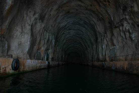 We seemed to be the only people in the little hamlet of mostly holiday apartments, apart from a lone cat, although there was a flotilla rafted up in the bay. We took the dinghy across the bay & inside the cavernous submarine pen to explore.
