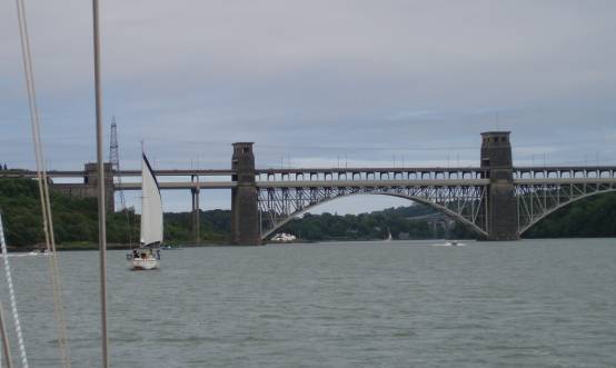 Then from 1 pm anyone wanting to move on was waiting for the dock gate to open as the tide came in. The first boat to try was too keen & ploughed several furrows in the mud before getting away. Being one of the deeper draft we were not away until 1.40 pm to head north up the Menai Straits between Wales & Anglesey. These are very picturesque (woods, fields & stately homes rolling down to the water), plus little towns, docks & bridges, & for sailors Plas Menai, a well known sailing school. The Straits also have very complicated tides as being open to the sea at both ends the tides rush in from both ends & it is important to time ones arrival at the notorious middle section called the Swellies.