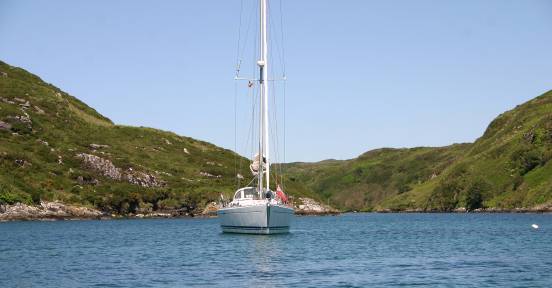 Wed 1st June. A relaxed start, just genny unfurled, threading through/round lots of islands – Adam, Eve, Rabbit, Low, High. Slow, so Doug fished, inspired by a distant fisherman in a very small boat, with loads of gulls. No change in our results. Then mid morning another skua, another gull, a brief interlude which the gull won! Late morning the wind died, the engine went on, the usual gannets & guillies off the headlands as we crept into Barlodge Creek & into a small pool surrounded by rocks, & dropped anchor. 11.8 nm.